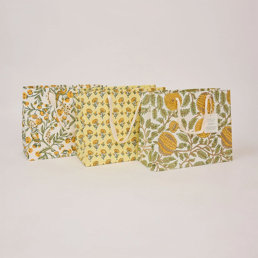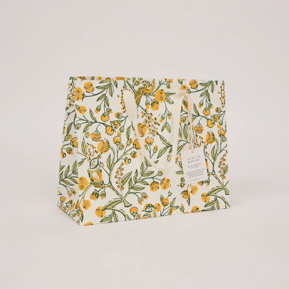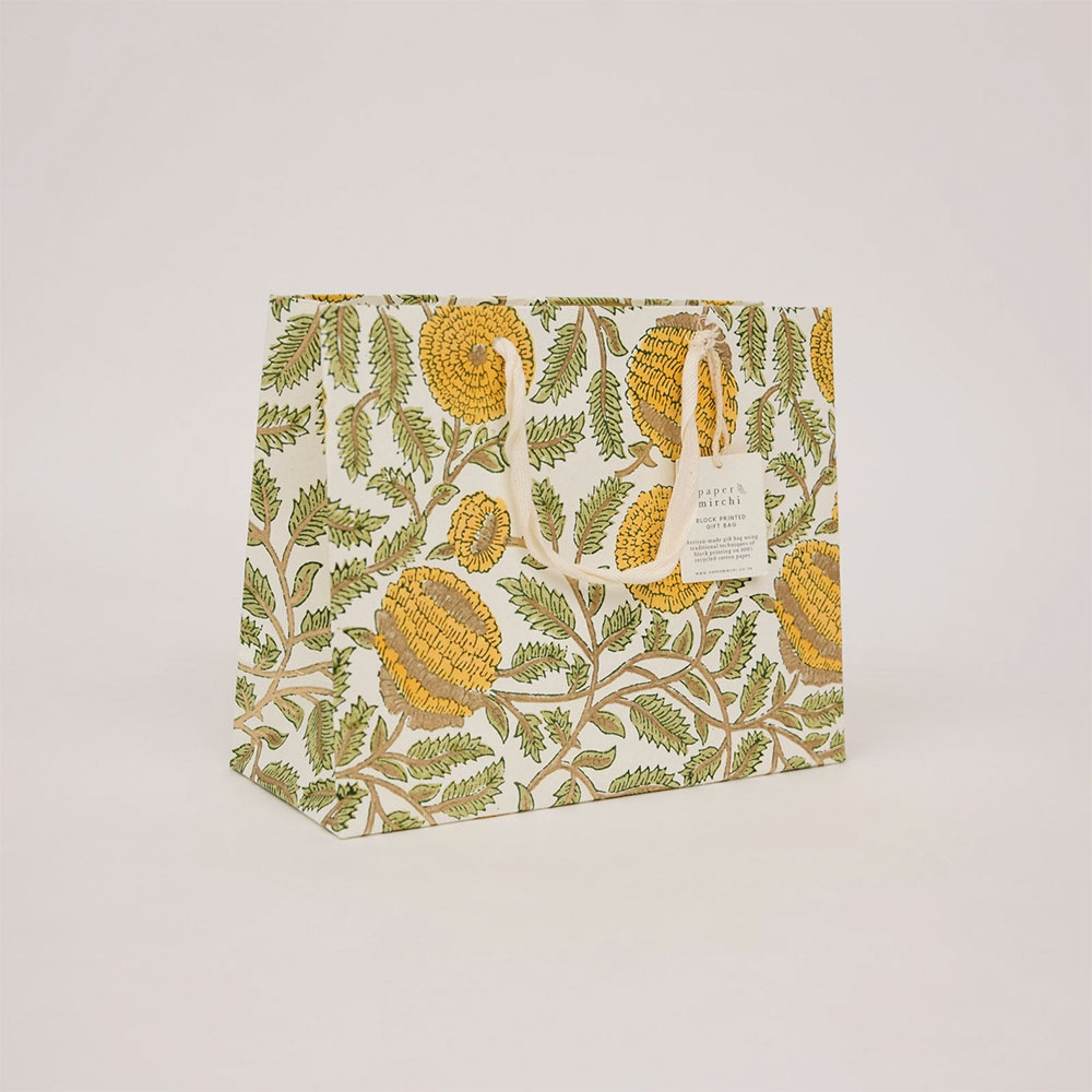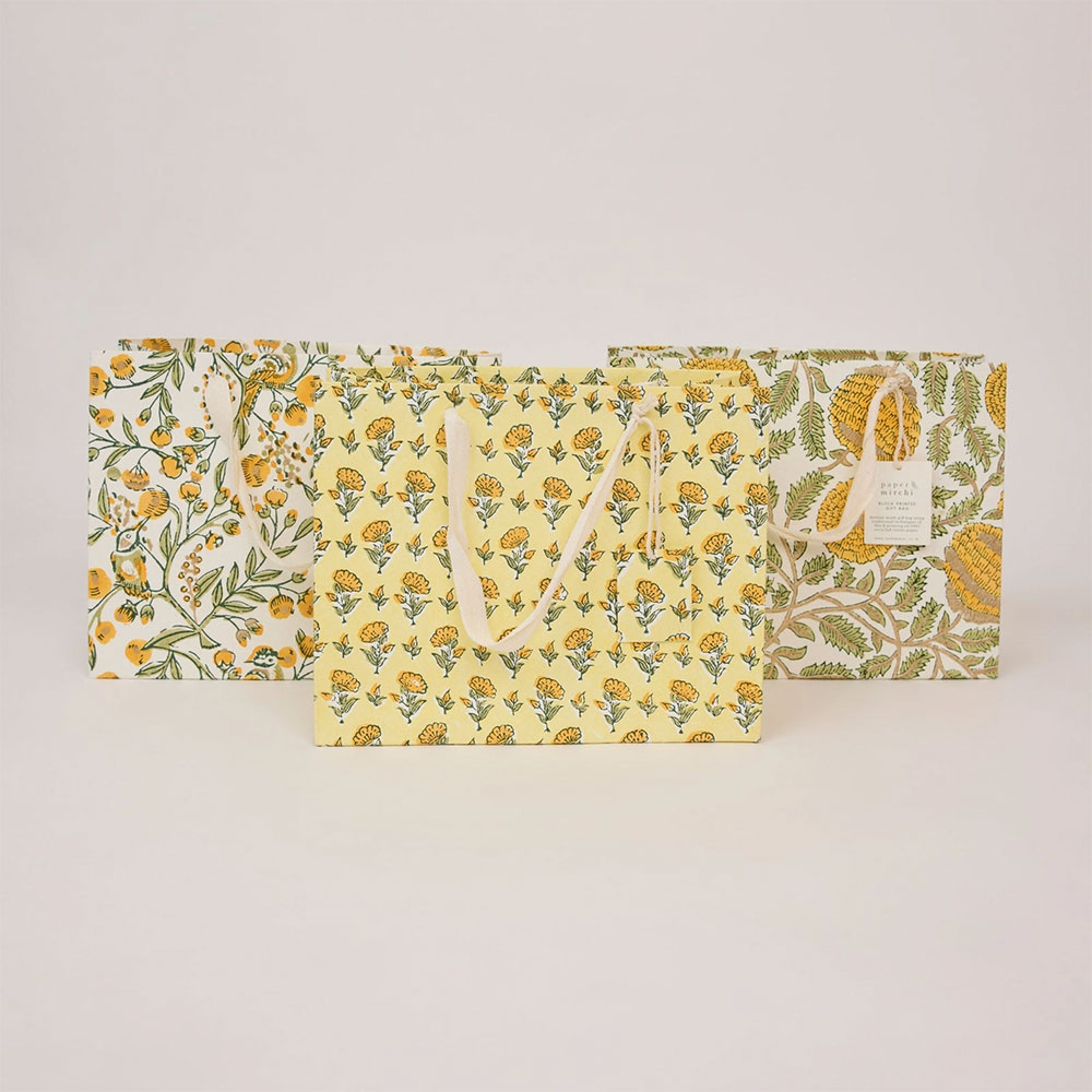 Papirproduksjon er et eldgammelt håndverk i India. Håndverkerne er lidenskapelig opptatt av håndverket sitt, som har gått i arv gjennom generasjoner, og hos Paper Mirchi fortsetter de å samarbeide med disse små familiedrevne virksomhetene i delstaten Rajasthan i India. Håndskårne treklosser brukes til å stemple vakre motiver manuelt med en egen trekloss for hver fargeapplikasjon. Les mer om Paper Mirchi her.