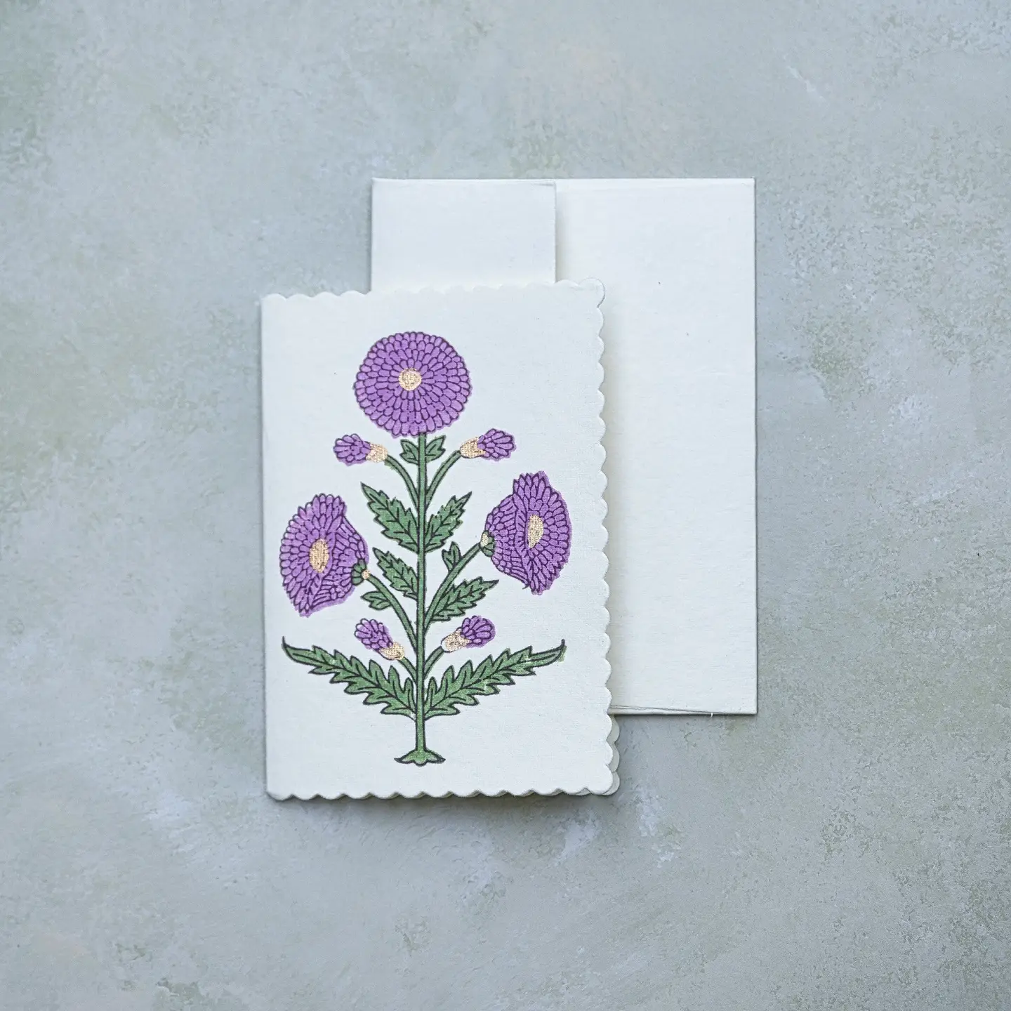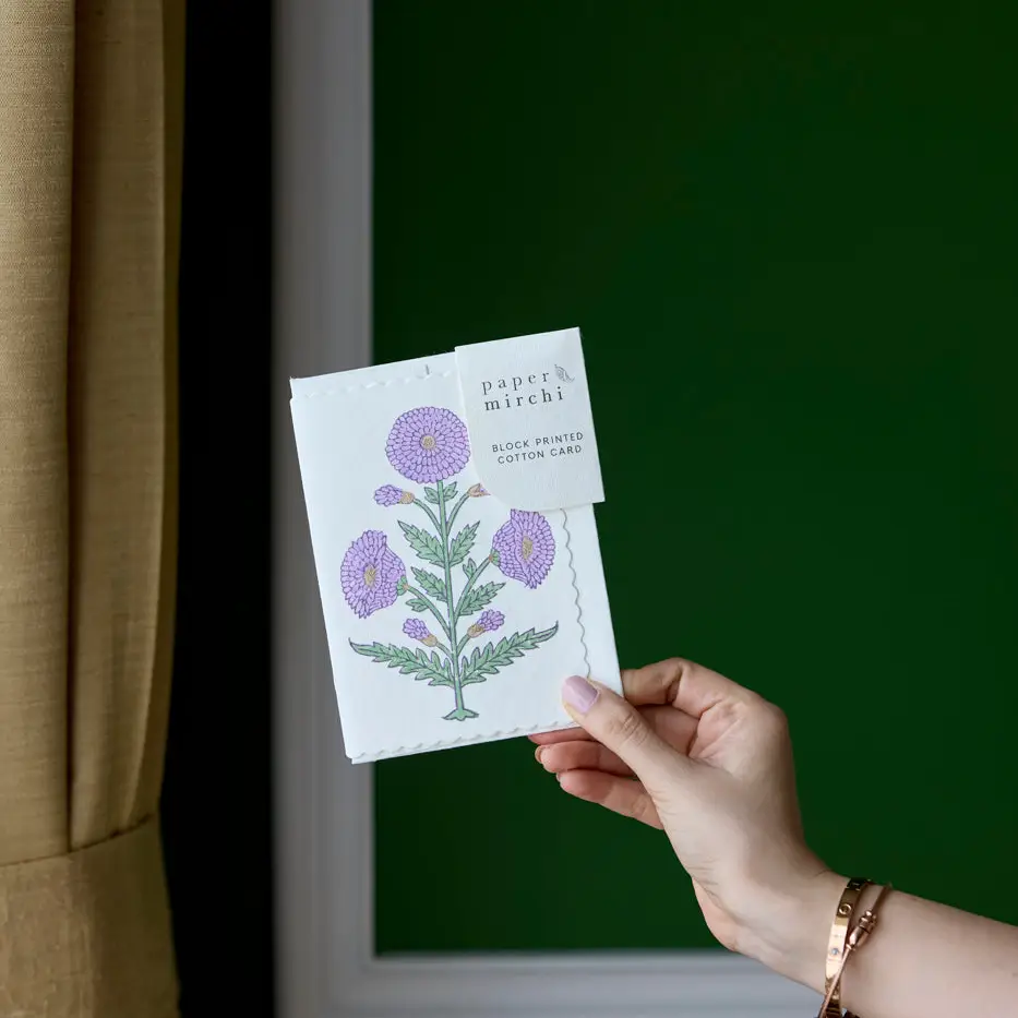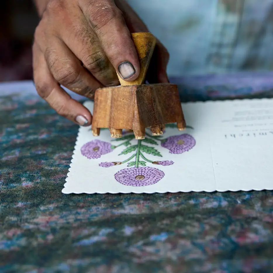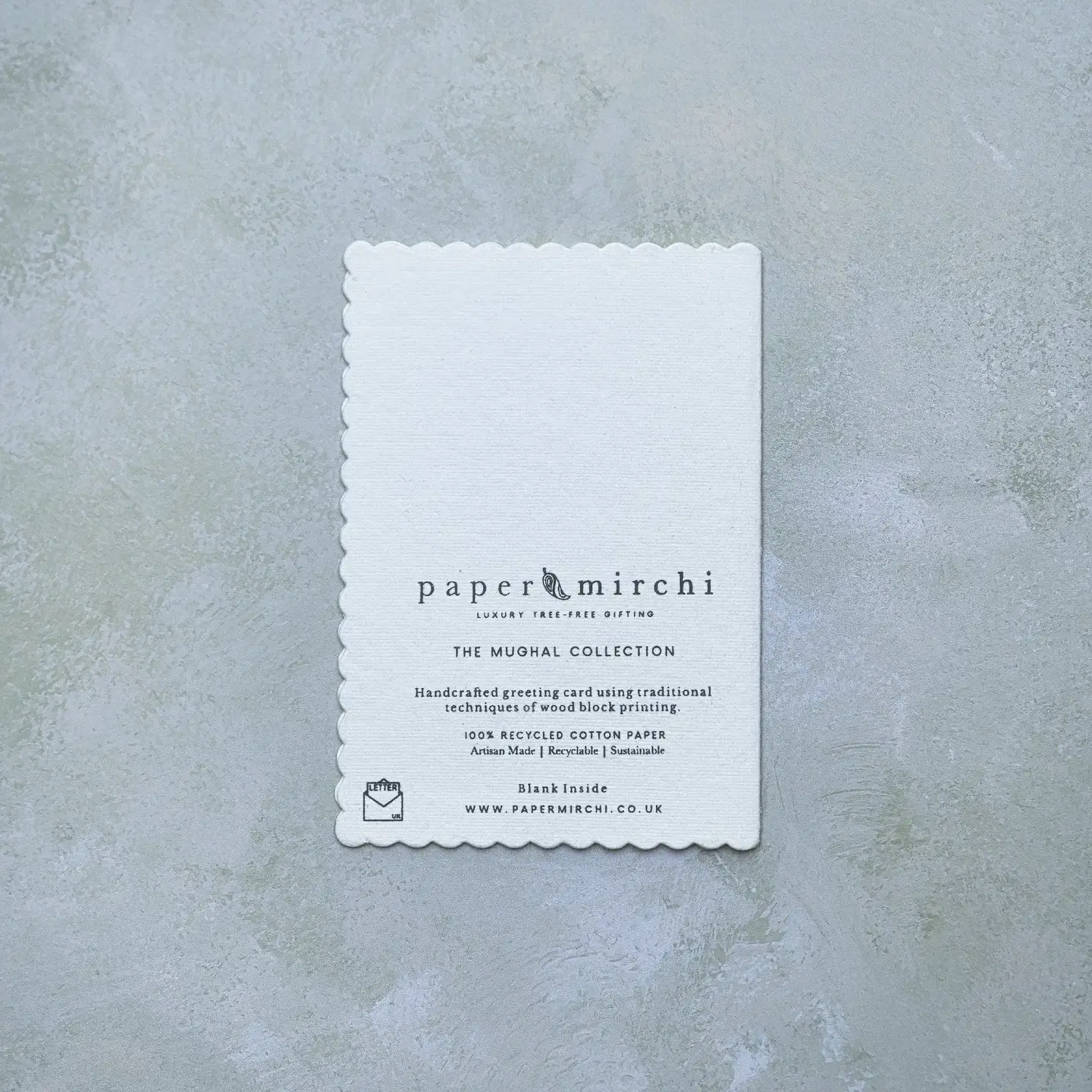 Hvert kort er møysommelig laget av dyktige håndverkere i India, med teknikker som har gått i arv gjennom generasjoner. Kortene består av tykt papir laget av resirkulert bomull med blokktrykk gjort for hånd, så ingen kort er derfor like. Det medfølger konvolutt med tilsvarende trykk på innsiden.