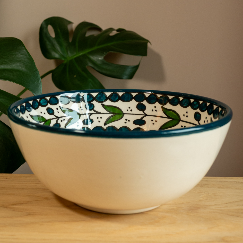Keramisk skål med tradisjonelt palestinsk mønster, håndlaget i Al Khalil av Hebron Glass.