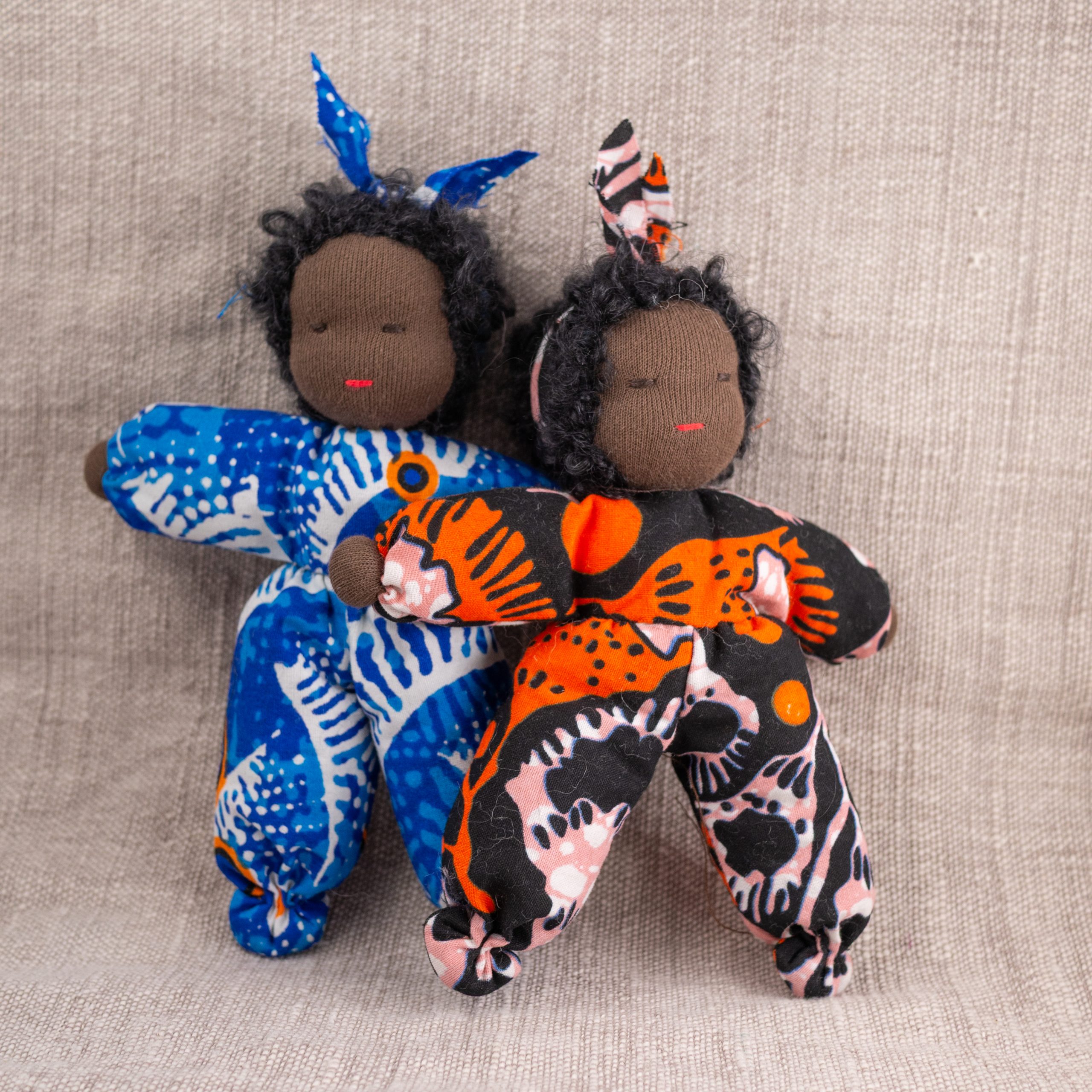 Dukke med nydelig teksturert hår og drakt i vest-afrikansk stoff. En perfekt lekekamerat og bestevenn for livet!