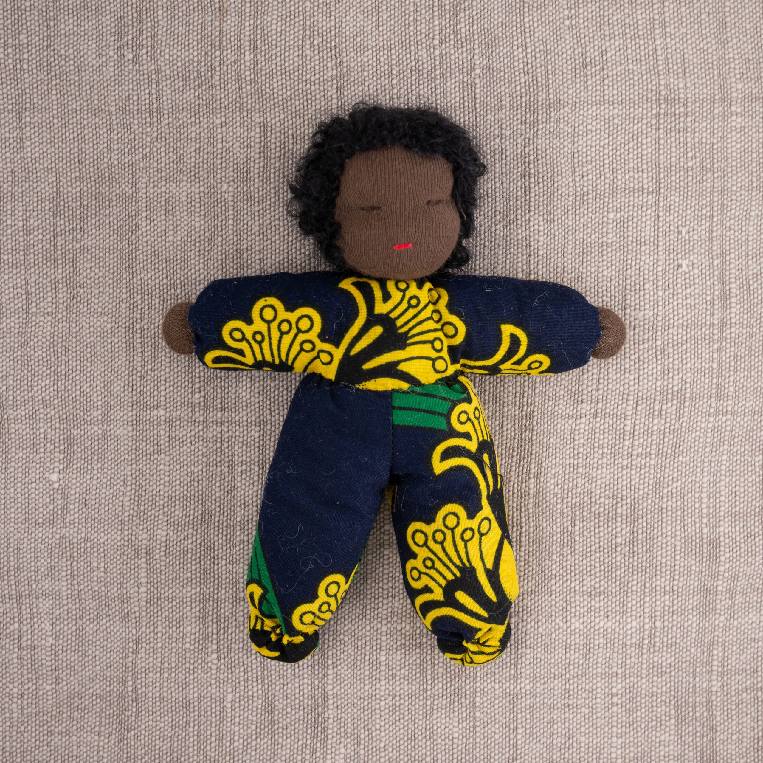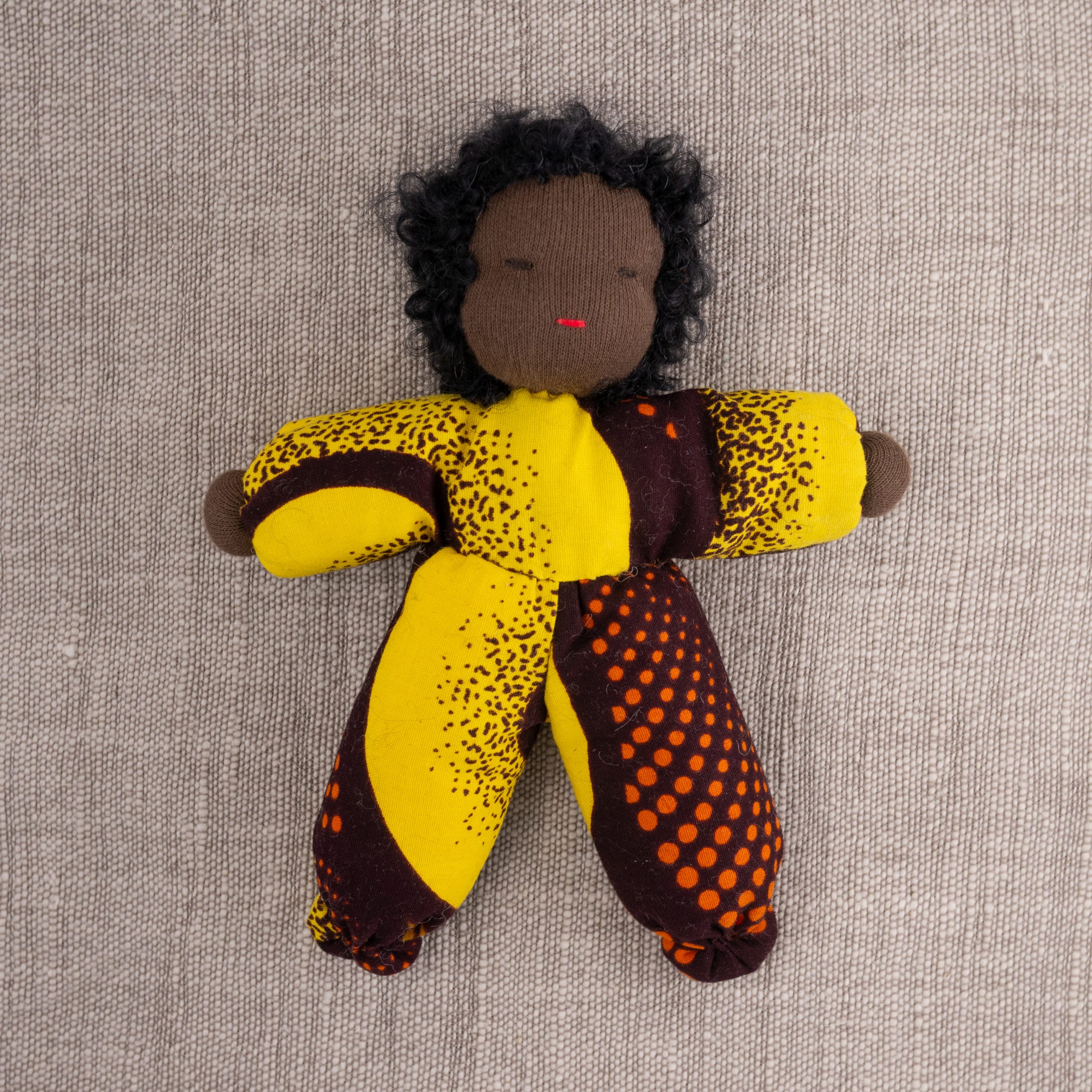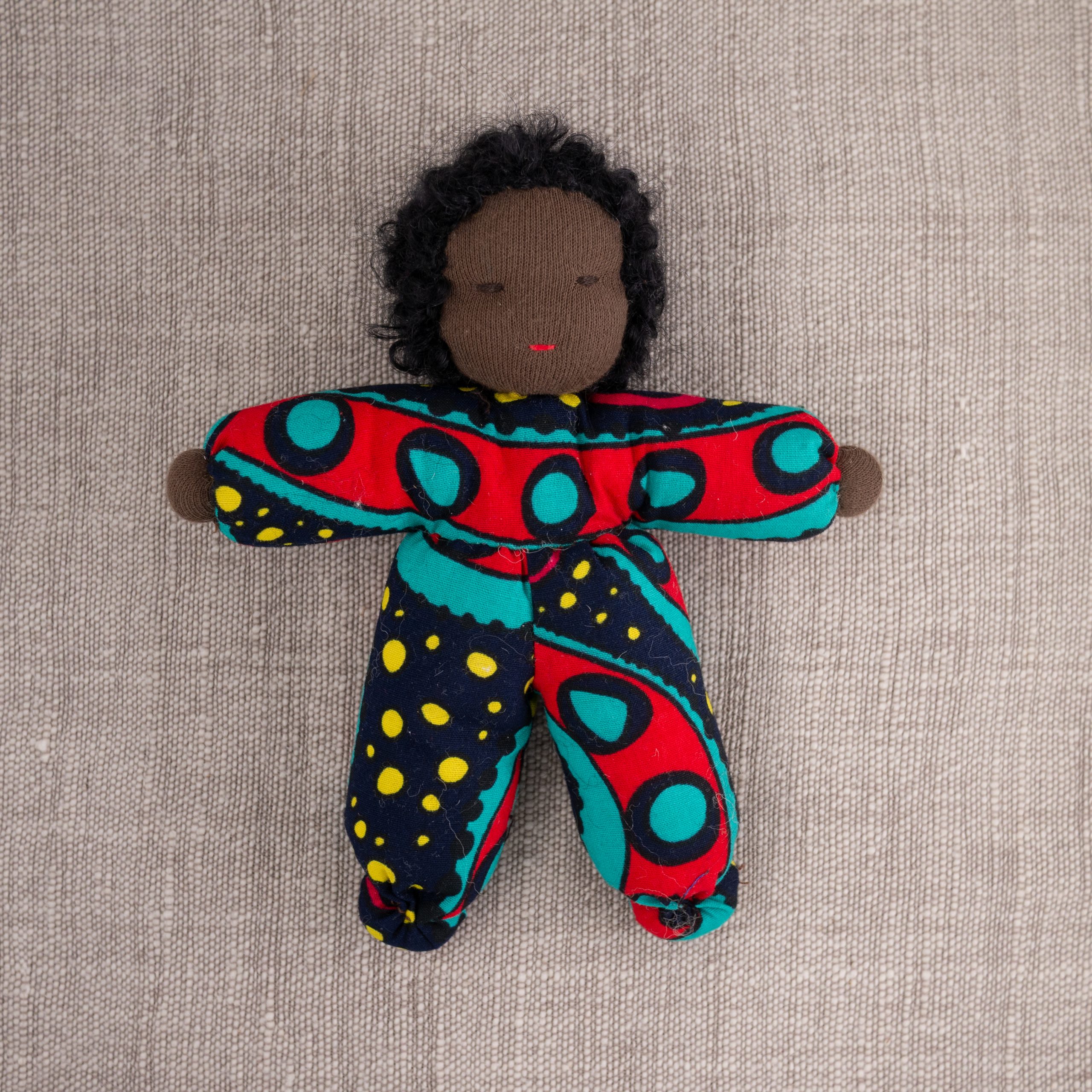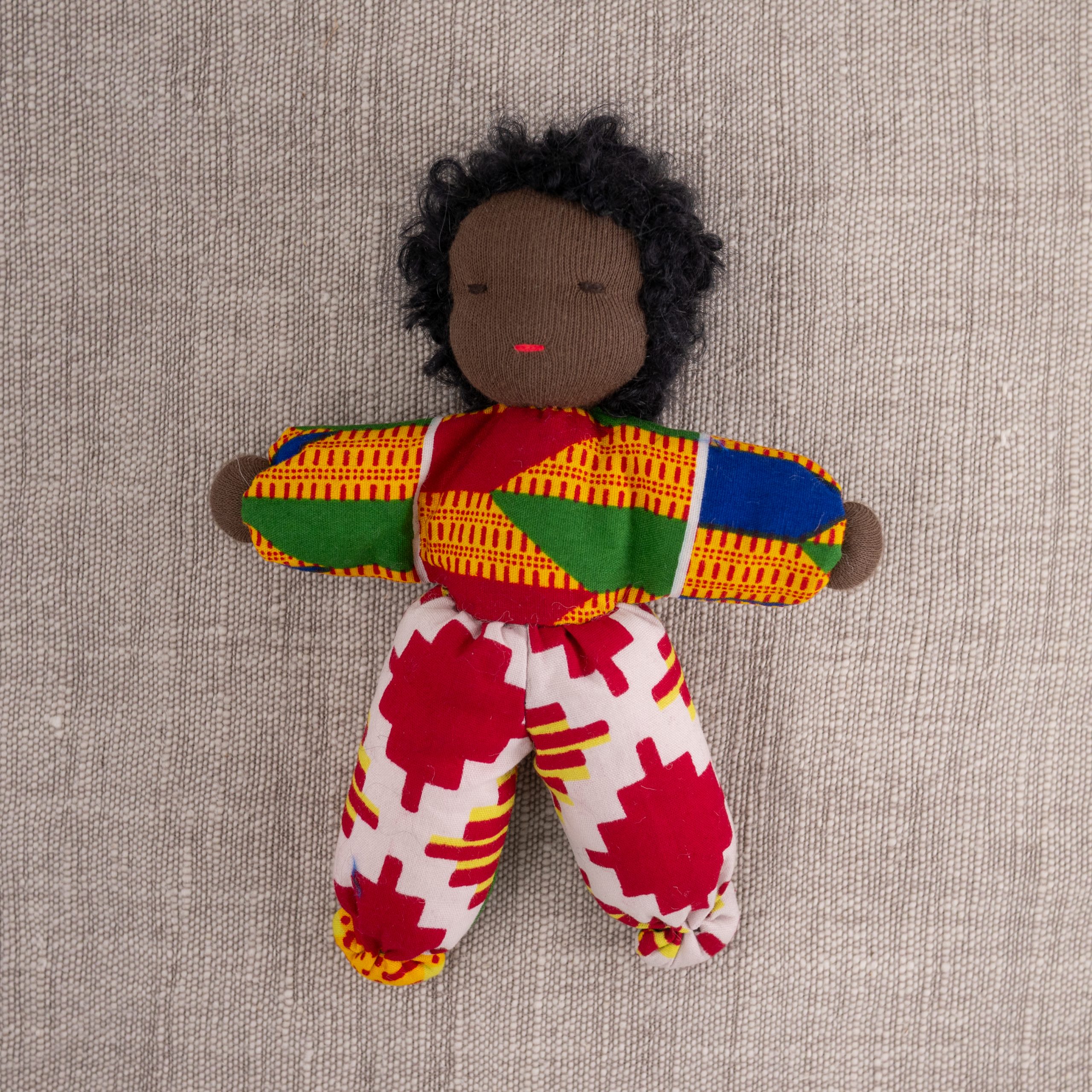 Dukke med nydelig teksturert hår og drakt i vest-afrikansk stoff. En perfekt lekekamerat og bestevenn for livet!