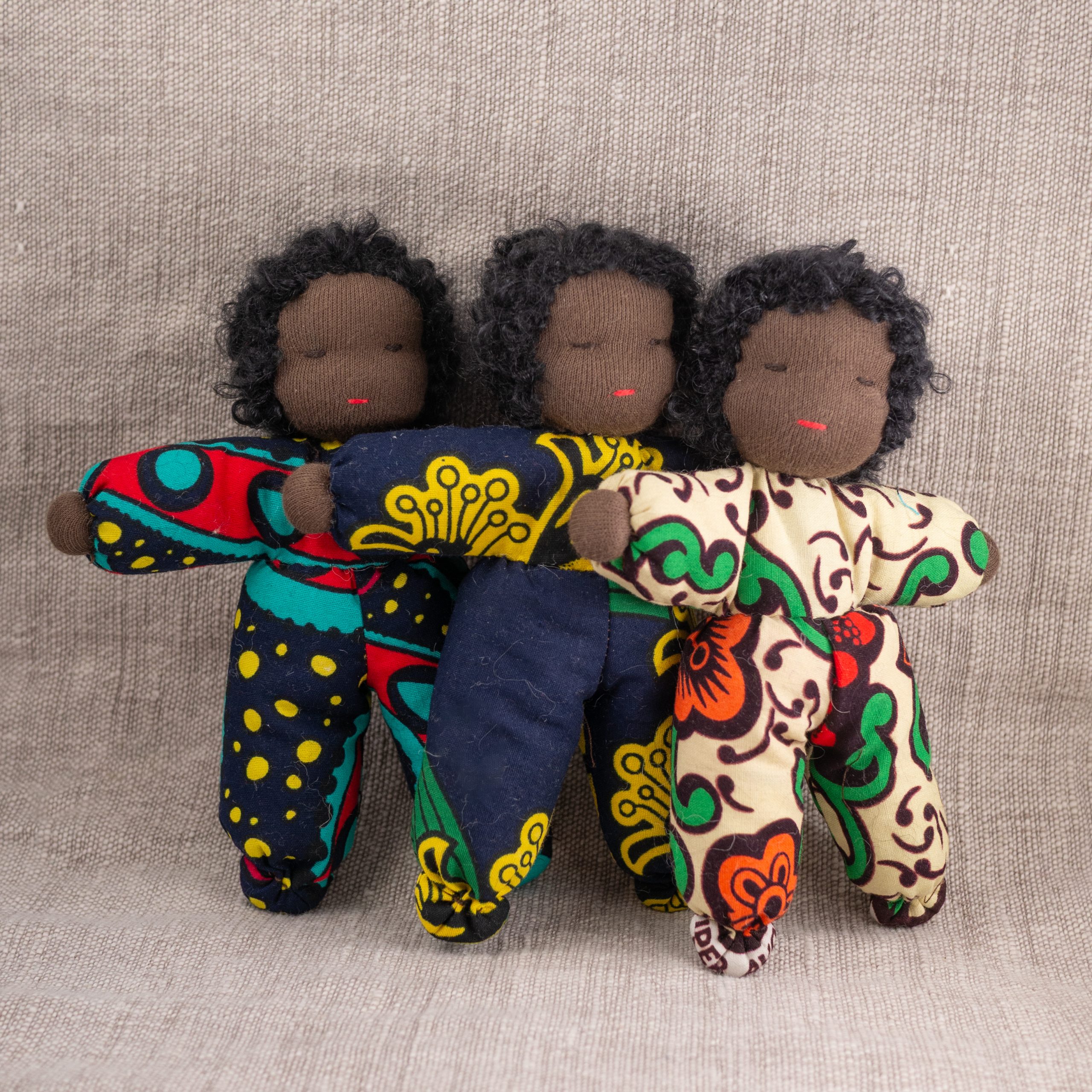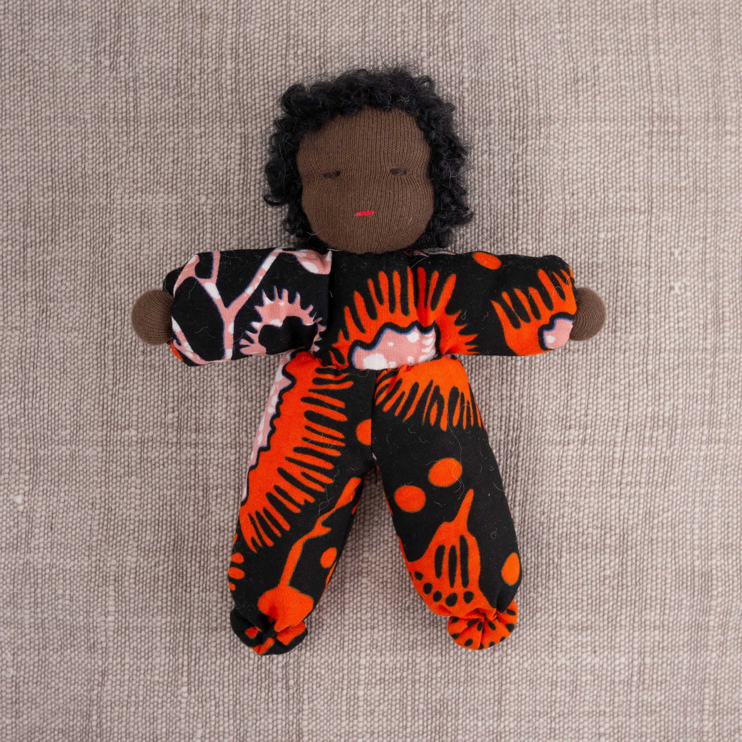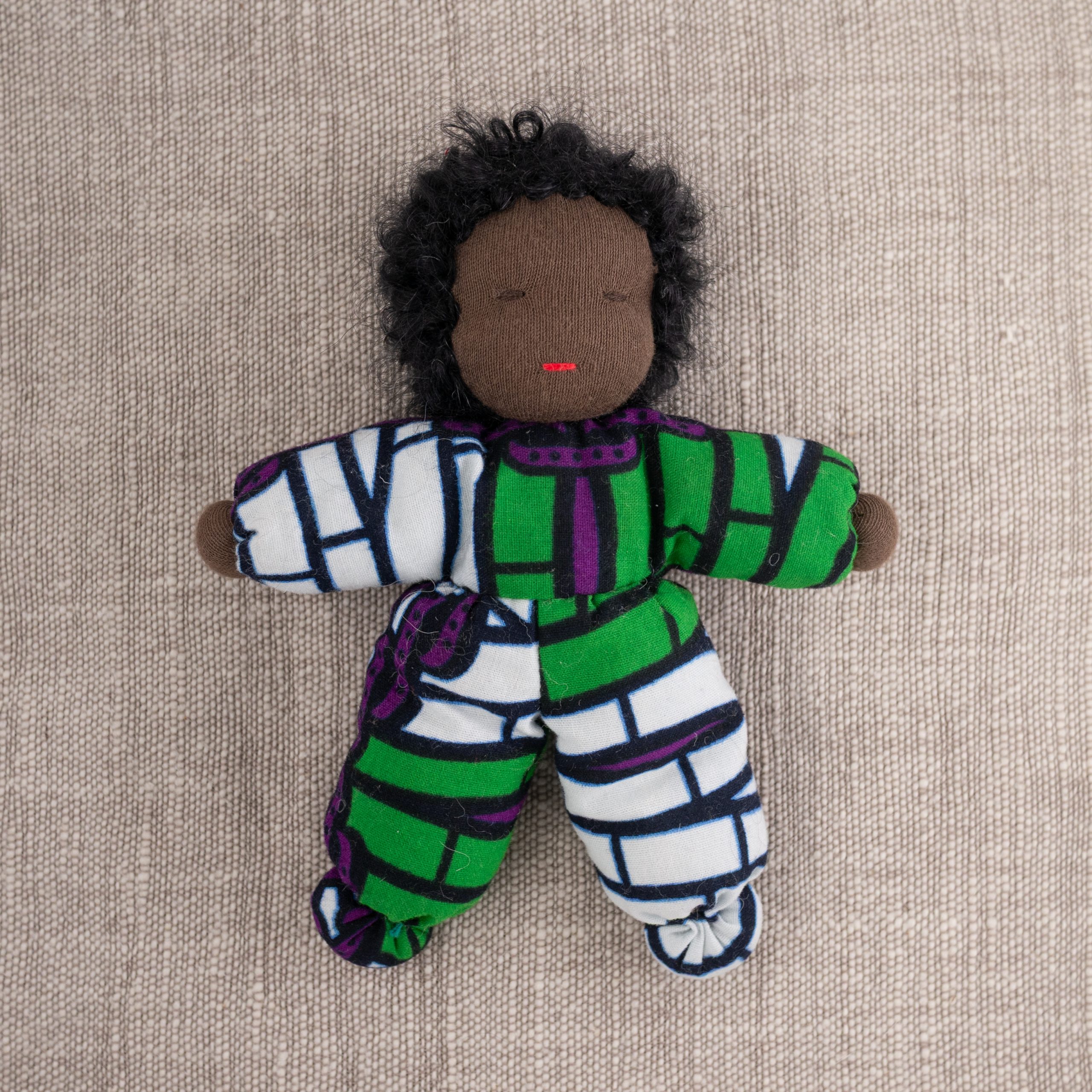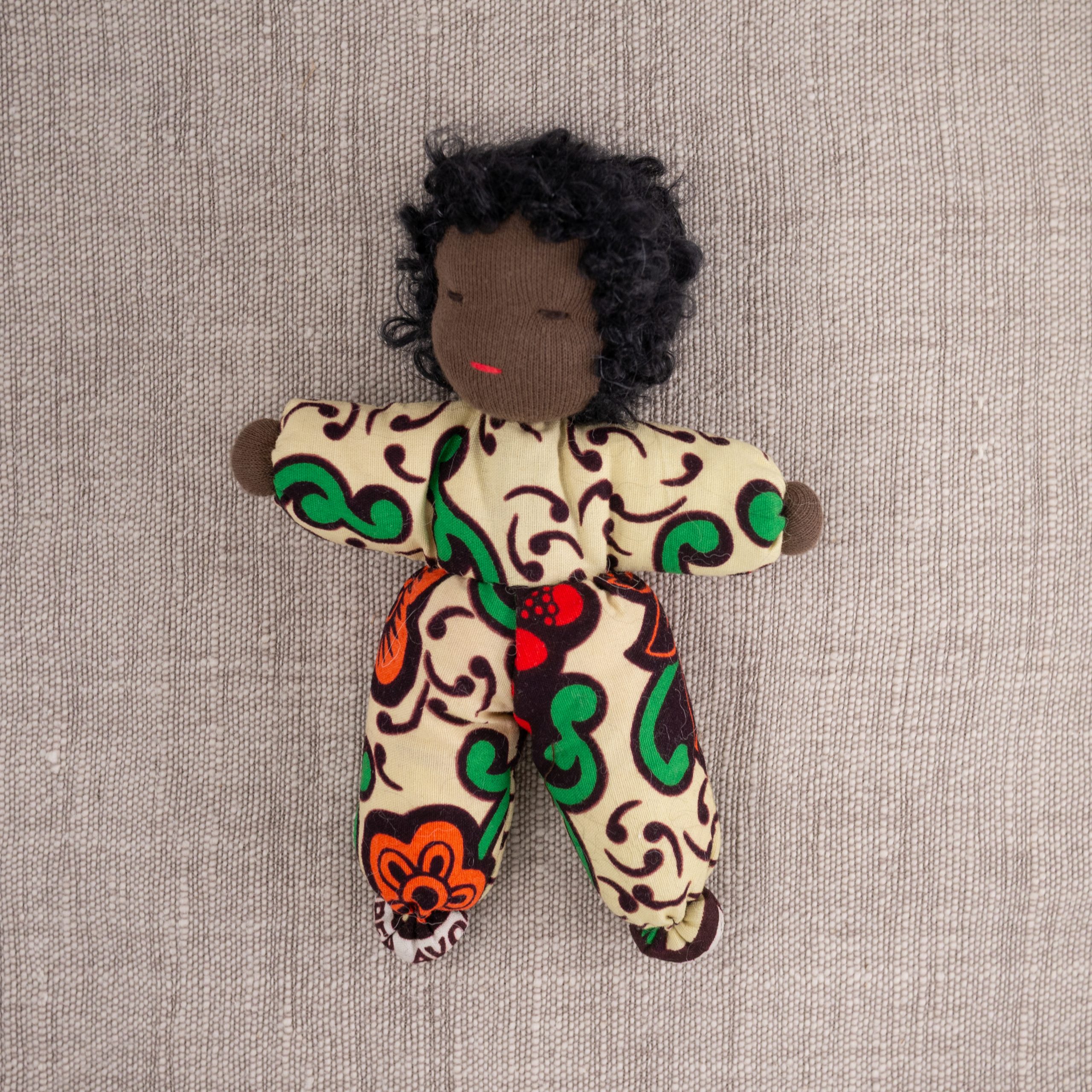 Dukke med nydelig teksturert hår og drakt i vest-afrikansk stoff. En perfekt lekekamerat og bestevenn for livet!